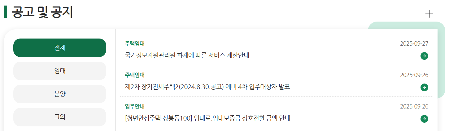 - 청약/공고: 입주자 모집공고, 전자청약, 당첨자 발표